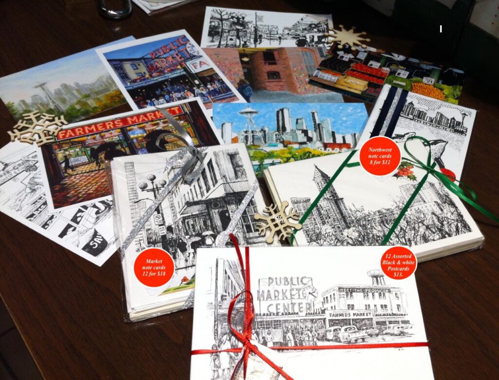 Stop into the Market’s longest-running gallery at the Art Stall, where you can shop directly from the artists themselves at this all women-owned artist’s cooperative. Take advantage of fine art quality without the added price tag! Browse an array of illustration prints in watercolor, ink, acrylic and more. Find signatures scenes capturing life at Pike Place Market and the Pacific Northwest, along with colorful pieces focusing on the landscapes beyond. This holiday season, enjoy bundle deals on notecards and postcards of Seattle scenery, priced between $12-$18.