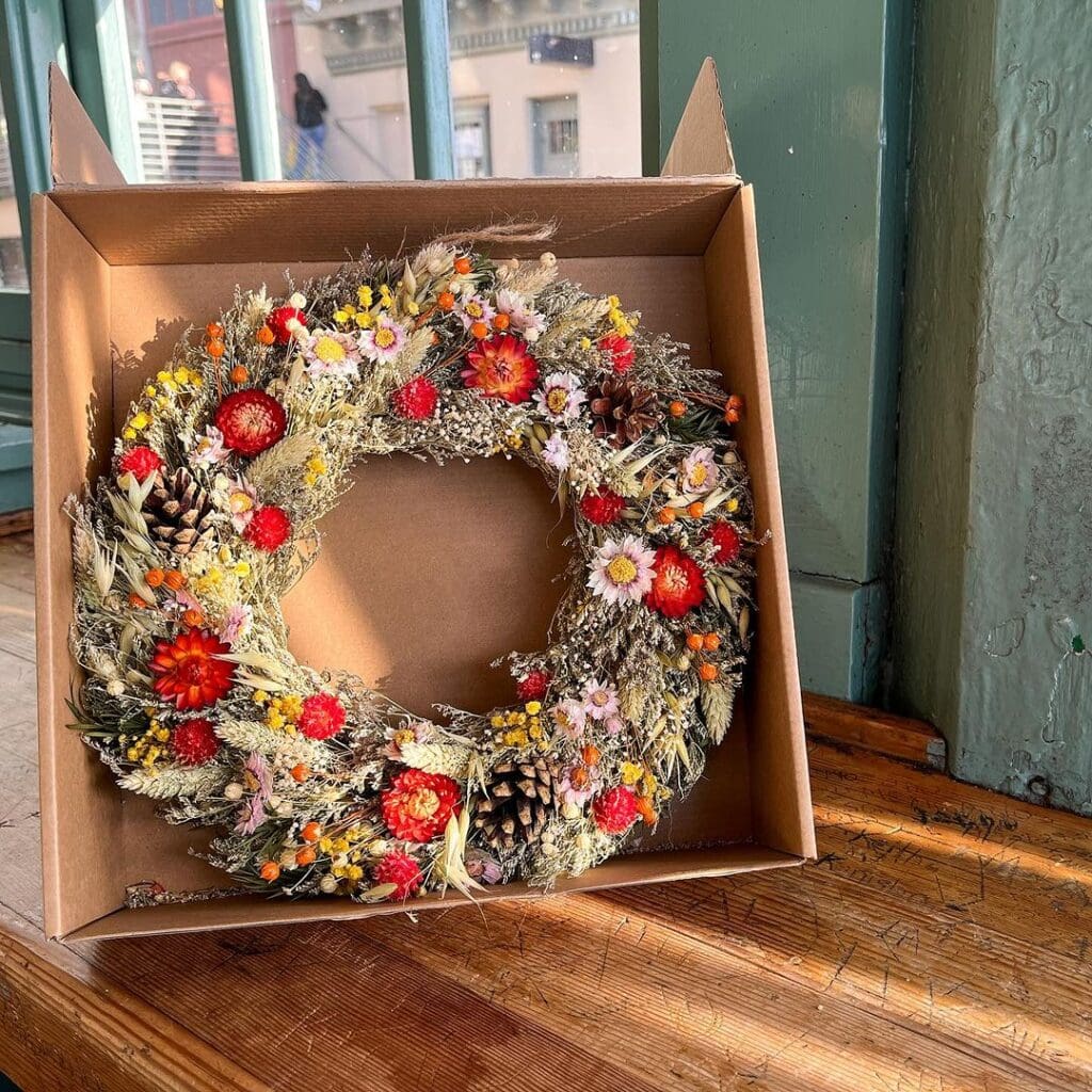 A signature of the season amongst our Market farmers is their elegantly arranged dried flower works grown and preserved by hand. At Lee Family Farm, you’ll find them in colorful wreaths assembled with real naturally dried blooms. There are a range of styles and sizes, lasting for years when taken care of properly indoors. Browse their selection in the Main Arcade highstall across from Pure Food Fish, or see options to ship available online!