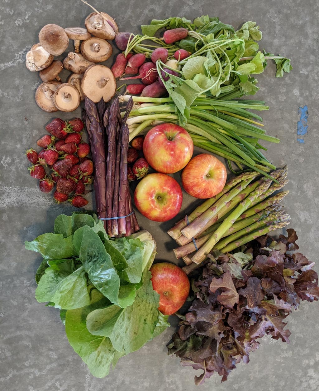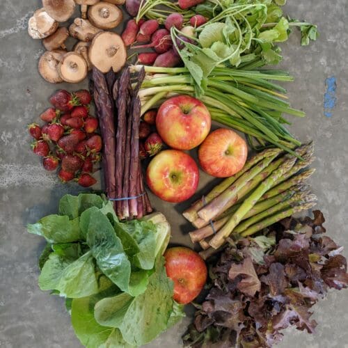 The Full Share contains 7-8 produce items, at least two of which are fruit. This share feeds 1-2 people who frequently eat fresh produce during the spring and summer, or a household of 3 or more that eats a moderate amount of produce.